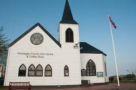 Along the waterfront, in the middle of the festive crowds, was a small white chapel.  It was, in fact, one of the things we had come to the waterfront to see:  the Norwegian Seafarer’s Church.  For centuries, it had been a spiritual haven for the Norwegian sailors who crewed the fishing and merchant ships based in Cardiff, and among those who were christened there was the children’s writer Roald Dahl, author of such classics as “James and the Giant Peach” and “Charlie and the Chocolate Factory.”  Yet for 30+ years, this charming church building has fallen out of religious use, and today it is a combination coffee shop and art gallery, with no religious activity at all.